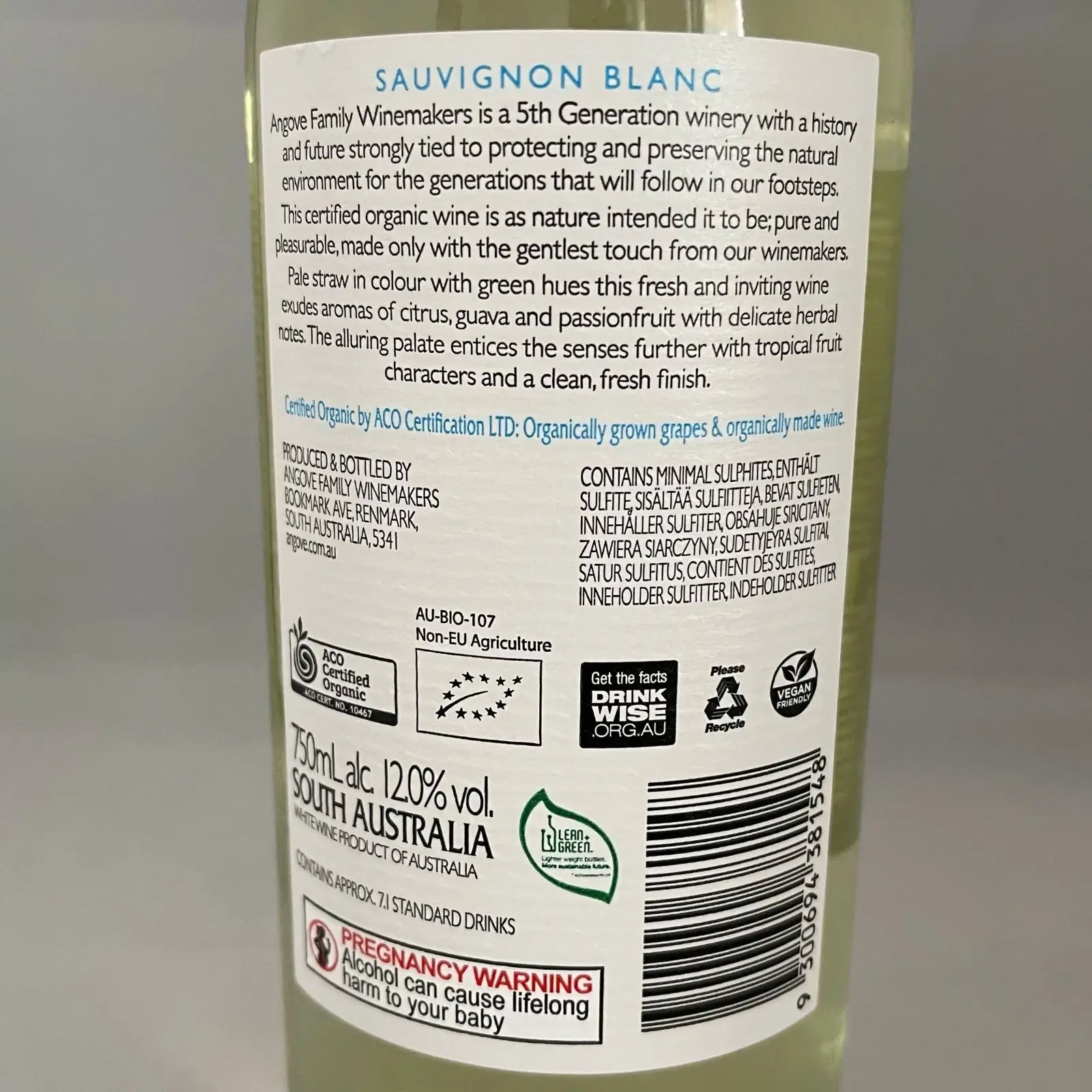 Tasting Notes for Angove Organic Sauvignon Blanc 2022 from the Winery