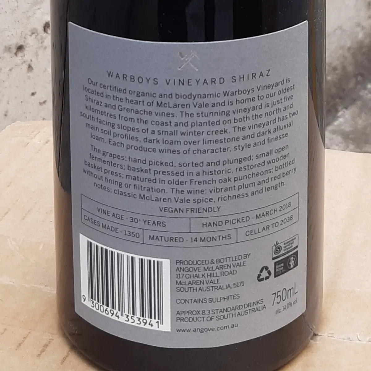 Sourced from our organically certified Warboys Vineyard in McLaren Vale. Average Winter rainfall and a dry Spring checked initial vine growth and reduced disease pressure in the vineyard. Budburst and flowering occurred in line with the long term average in mid-September. Thankfully, stable dry conditions occurred at flowering resulting in excellent fruit set. The dry, stable conditions continued throughout Summer with rainfall being up to 80% lower than averages. January experienced 14 consecutive days over 30ºC but thankfully nothing over 40°C. With access to both recycled and artesian water and were able to develop the vines carefully with controlled irrigation. February was generally cool and mild and grapes were harvested in pristine condition. Wines from this vintage are lively, aromatic and vibrant with delicious dark berry flavours and spice, finishing with resounding length and delicacy.