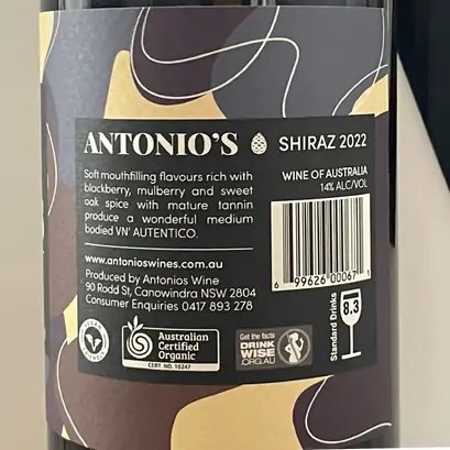 Tasting notes from the winery for Antonio's Organic Shiraz 2022