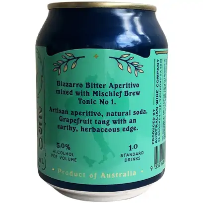 This here is the Bizzarro Tonic – a collaboration with our friends from Mischief Brew Sodas, we’ve blended Bizzarro with their Bengal Tonic to create an all natural, low ABV and insanely delicious canned drink. Grapefruit tang with an earthy, herbaceous edge, the Bizzarro and Mischief Brew Tonic is a completely unique beverage made for straight from the can glugging. Artisan aperitivo, natural soda, exquisite drinking.