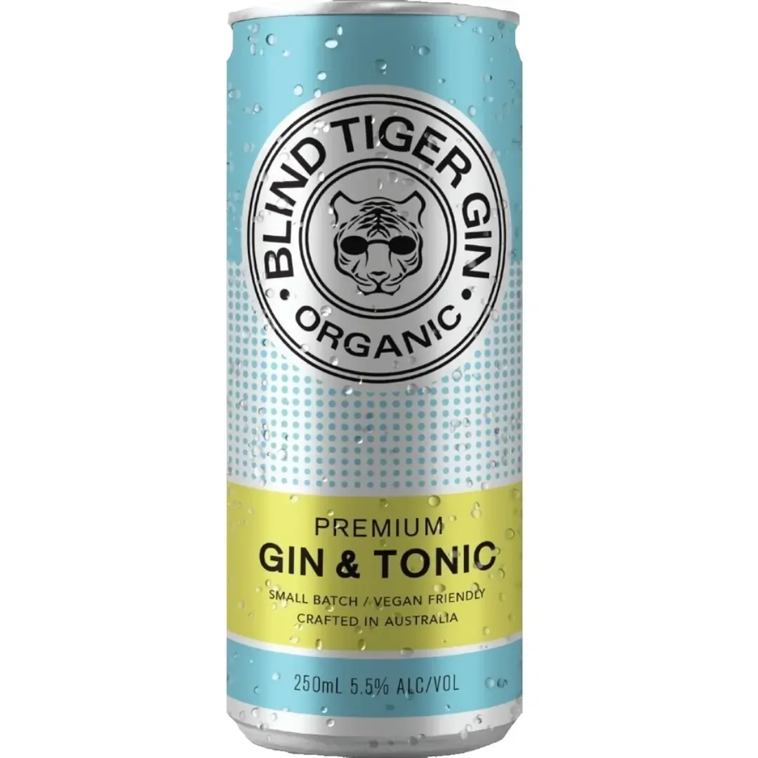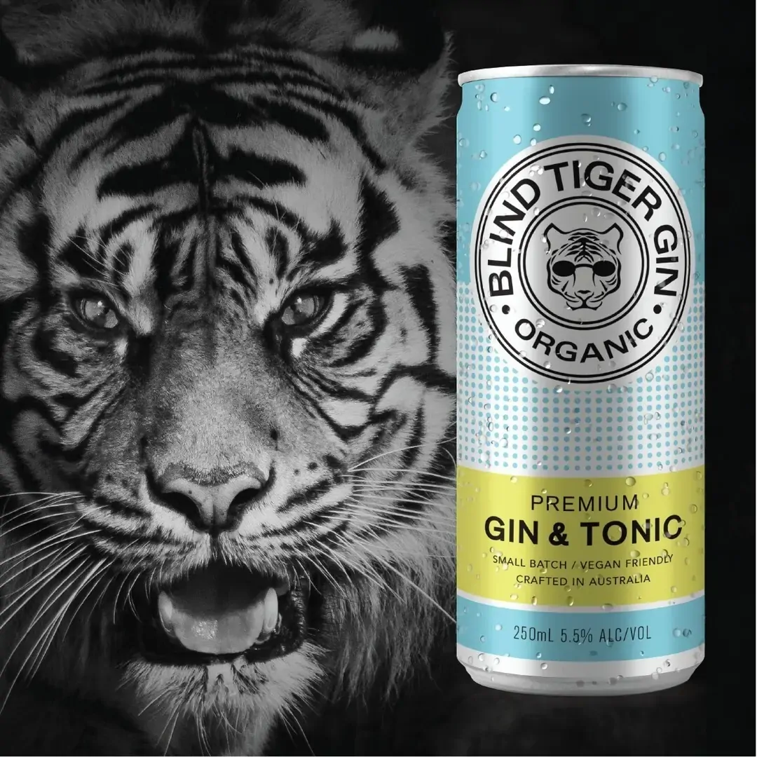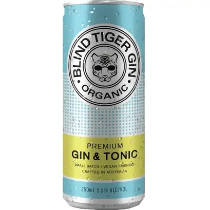Locally-produced, premium canned RTD; Blind Tiger Organic Gin & Tonic in a convenient 250mL size.