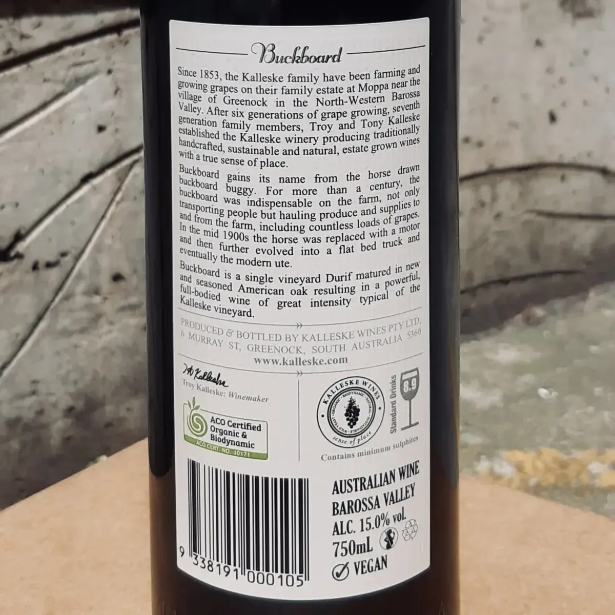 The Kalleske vineyard and farm was established at Greenock in the Barossa’s North-West in 1853. For more than a century, the horse drawn ‘buckboard’ was indispensible on the farm. The buckboard buggy transported not only people but hauled produce and supplies to and from the farm, including countless loads of grapes. In the mid 1900s the horse was replaced with a motor and then the buckboard further evolved into a flat bed truck and eventually to the modern ute. Buckboard Durif is a single vineyard wine that’s been grown, vintaged and matured on the Kalleske property. Vigilant grapegrowing, traditional winemaking and maturation in new and seasoned American oak hogsheads has resulted in a powerful, full-bodied wine of great flavour and intensity.