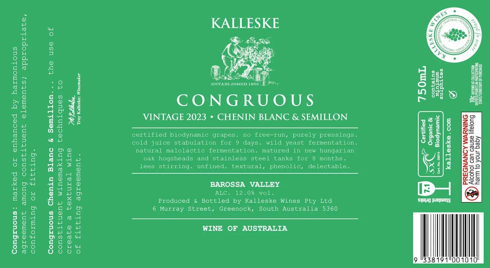 On the palate, it is medium-bodied, featuring a harmonious blend of white stone fruits and rich pome fruits. The oak influence is refined and well-integrated, contributing richness, roundness, and subtle notes of nuts, caramel, and a whisper of toast. A soft, creamy, buttery texture adds to the wine’s plush mouthfeel. Light grape skin phenolics and gentle new oak barrel tannins introduce a touch of astringency, balancing the wine’s overall opulence. The finish is long and lingering. Congruous 2024 is a flavourful, textural white wine that beautifully showcases the finesse of Barossa pressings, thoughtfully crafted with pertinent winemaking technique.