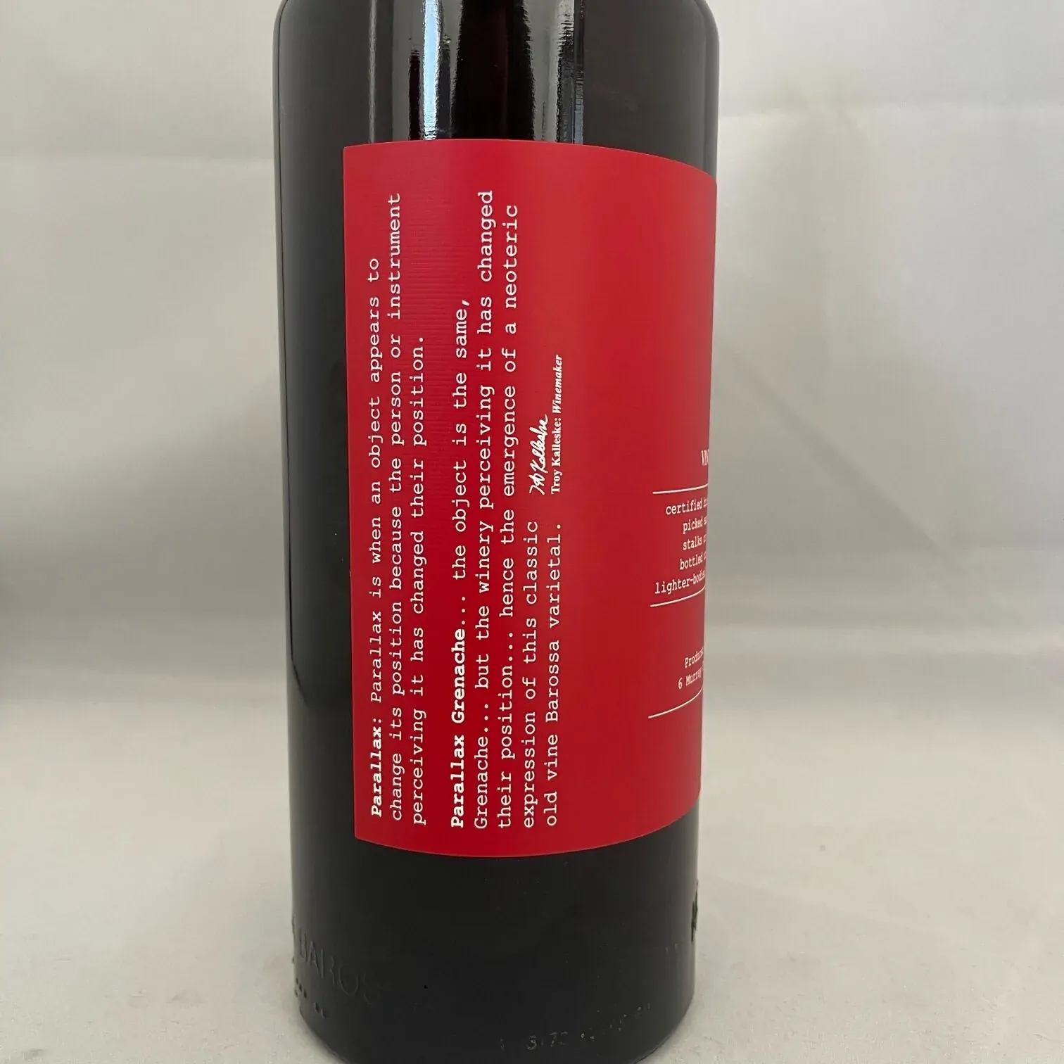 Parallax Grenache… the object is the same, Grenache… but the winery perceiving it has changed their position… hence the emergence of a neoteric expression of this classic old vine Barossa varietal…