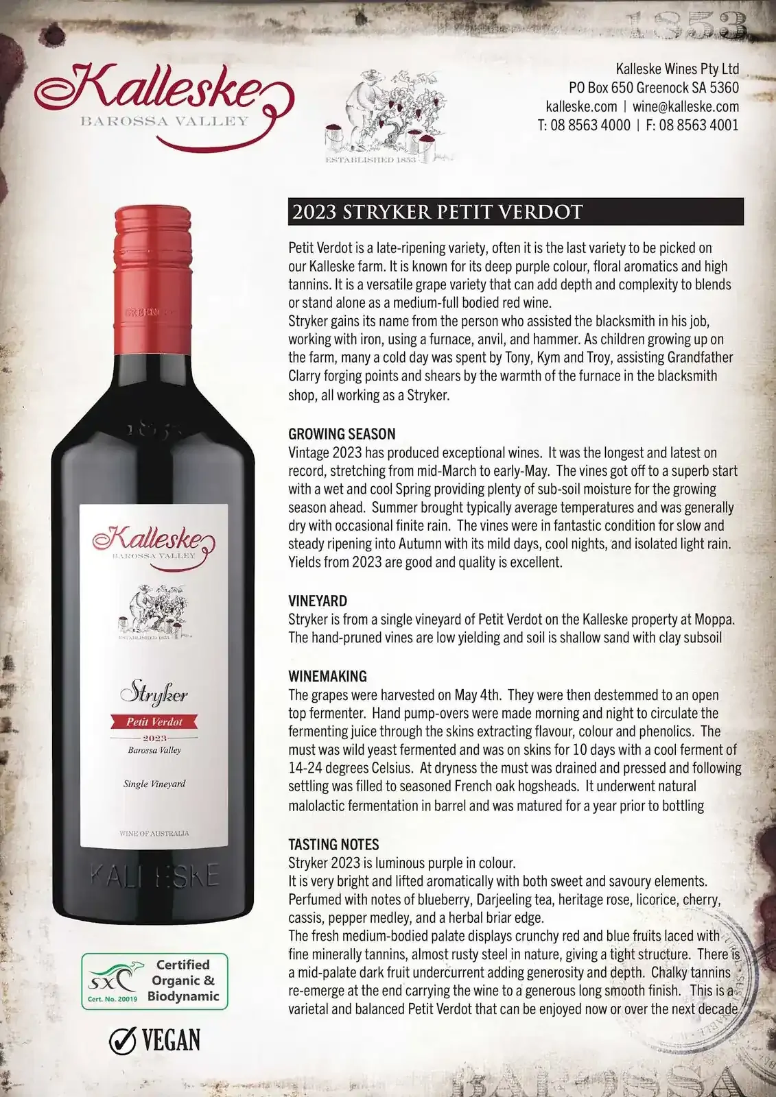 Stryker is from a single vineyard of Petit Verdot on the Kalleske property at Moppa. The hand-pruned vines are low yielding and soil is shallow sand with clay subsoil.