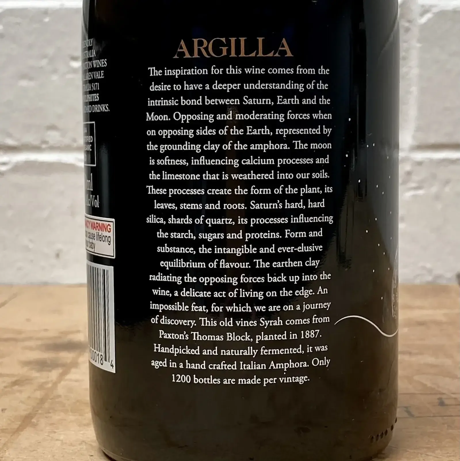 A limited release wine, the amphora-aged Argilla Syrah comes from fruit sourced from vines originally planted in 1887 from our Thomas Block vineyard, which is renowned for producing fruit of exceptional flavour and natural balance. These vines are amongst the oldest in McLaren Vale and are carefully hand pruned and thinned to ensure the low and uniform yields required for super premium Shiraz.