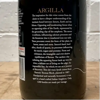 A new adventure for Paxton Wines with a beautiful amphora all the way from Impruneta in the foothills around Florence, Italy. The fruit from the ancient vines was hand-picked on a fruit day and partially destemmed and partially left as whole bunches into the amphora for a natural fermentation with no added yeast or any other products. The wine spent 41 days on skins with delicate hand plunges throughout the fermentation and was then gently basket pressed on a descending moon and put straight back to the amphora for further six months before bottling with minimal sulphites.