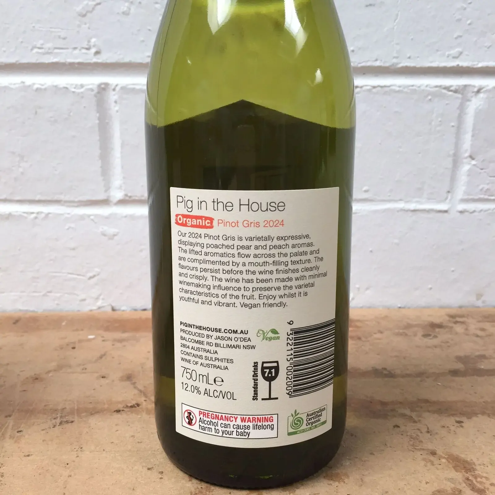 Aromas of poached pear, peach and a touch of honeysuckle contribute to a delicious varietal bouquet. These flavours are displayed on the palate with a subtle texture and balanced acidity making it a food friendly wine. This would pair well with seafood, chicken or soft cheeses.The organic Pig in the House Pinot Gris is an aromatic wine demonstrating varietal pear and citrus aromas.The flavours of the bouquet follow onto the palate and are complemented with fresh acidity which adds to the refreshing nature of this wine.
