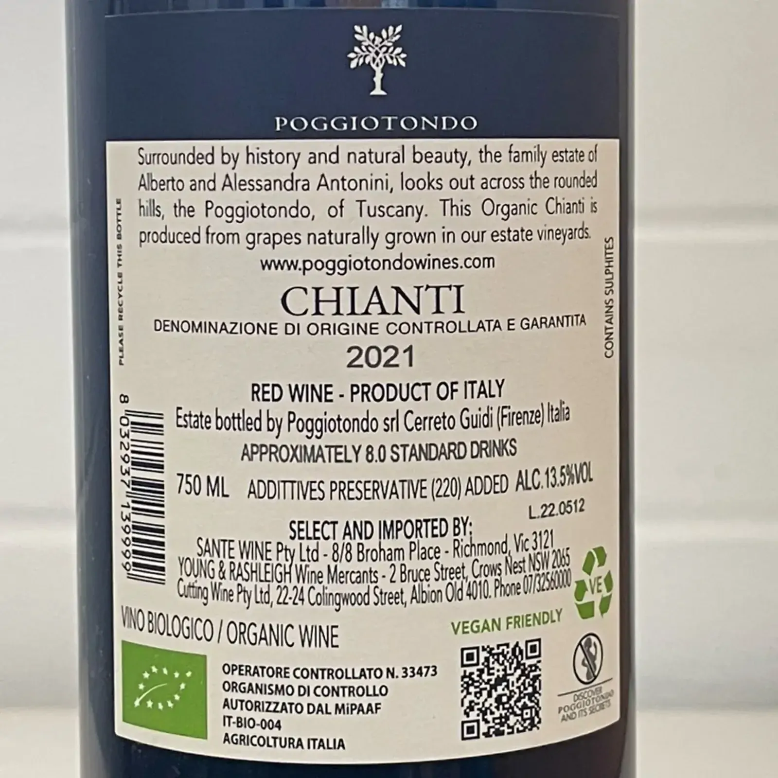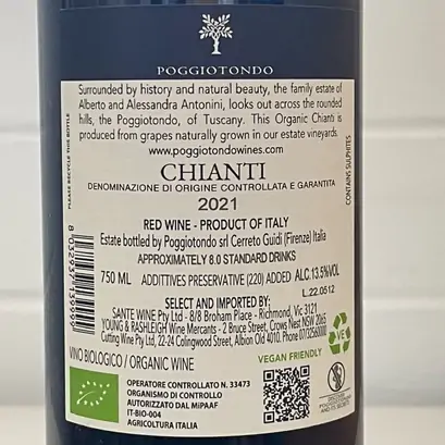 Surrounded by history and natural beauty, the family estate of Alberto and Alessandra Antonini looks out across the rounded hills, the Poggiotondo, Tuscany. The property was established in 1968 by Carlo Antonini, Alberto's father. This organic Chianti is produced from grapes naturally grown on the estate vineyards.
