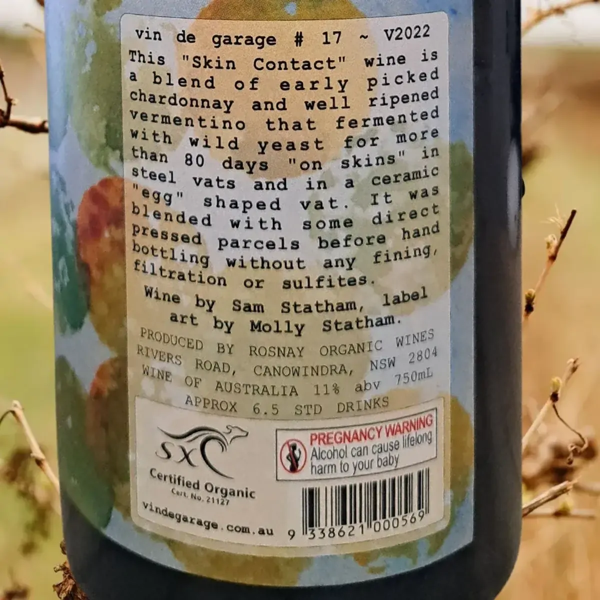 This is a crisp, low-alcohol, phenolic white blend of early picked Chardonnay fermented on skins in the “egg” (ceramic tank) for 80 days, and blended with direct pressed Vermentino. The Chardonnay skins, being early picked and green, impart a lovely tartness and soft acidity, which is enhanced by the citrussy zing of the Vermentino.