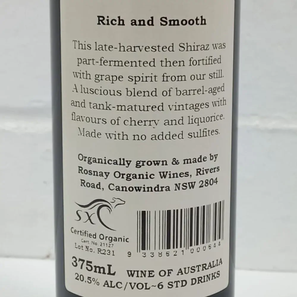 In 2022 we had the first opportunity in nearly a decade to produce a good fortified wine. The season was classic “La Nina” with a wet spring and summer producing a big crop of fat shiraz berries. Then, the autumn turned dry and we were able to leave about 5 tonnes of grapes out to dehydrate and concentrate the sugars to over 18 baume (an approximate dry alcohol level). The fruit was crushed and destemmed, cold soaked and then fermented in open vats until half the sugar was consumed. After this the wine was pressed, chilled and neutral grape spirit was added. Once the fermentation was complete and the wine had settled it was racked to oak barrels and aged for 12 months. At no stage were sulfites added to the wine.