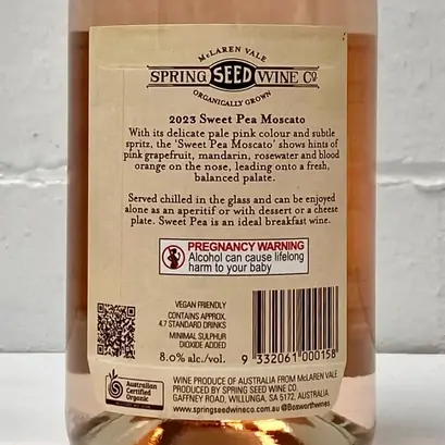 Spring Seed’s Sweet Pea Moscato shows pink grapefruit, mandarin, rosewater, and blood orange on the nose, carried by a gentle spritz and a fresh, balanced palate. Its pretty floral aromatics contrast with a subtly savoury finish, creating a charming sweet‑spot mid‑palate. Made from organically grown Muscat à Petits Grains (“Red Fronti”), it’s crafted as a slightly sweet, low‑alcohol (7%) pink Moscato ideal for brunch pairings, cocktails, or fruit‑based desserts.