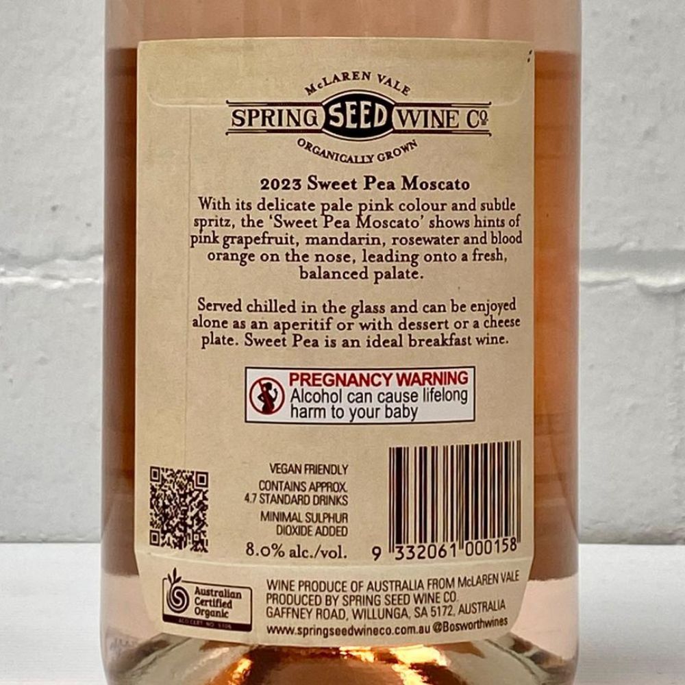 Spring Seed Wines are made from grapes lovingly grown in our family’s organic vineyard, located in the premium wine region of McLaren Vale, South Australia. The vineyard was established in the early 1970’s by Peter and Anthea Bosworth, and is now owned and run by their son Joch, who began the conversion to organic viticulture in 1995. The vines are fully certified ‘A’ grade organic by Australian Certified Organic, a process that takes four years and involves yearly audits and random sampling of produce. The Spring Seed Wine labels are unashamedly inspired by vintage flower seed packets created at the turn of the last century. The colour, clarity and beauty of the original seed packets are quite remarkable. We have chosen the Sweet Pea image for our Moscato.