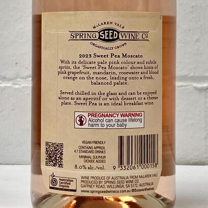 Bright pink colour and subtle spritz, the ‘Sweet Pea Moscato’ shows hints of pink grapefruit, mandarin, rosewater and blood orange on the nose, leading onto to a fresh, balanced palate.